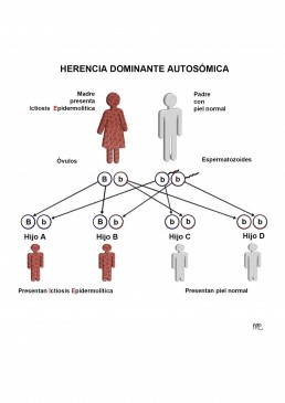 La ictiosis epidermolítica o hiperqueratosis epidermolítica se utiliza como ejemplo en esta sección, pero la genética también se aplica a todos las demás enfermedades de carácter autosómico dominante.