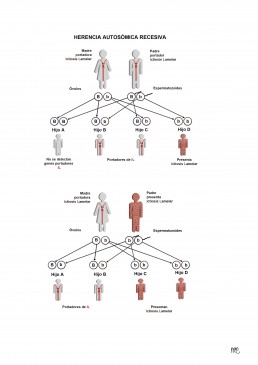 En la herencia autosómica recesiva, ambos padres de la persona afectada son portadores. Ya que no tienen ictiosis, por lo general descubren que son portadores cuando tienen un hijo con este trastorno. La razón por la que su piel es normal, se debe a la influencia de su gen dominante «B» sobre el gen recesivo «b». En este caso, el gen «B» es para la piel normal, que es dominante sobre el gen «b» de la ictiosis lamelar. Cualquier hijo de esta pareja que hereda un gen «B» va a tener piel normal, pero el niño que recibe una gen «b» de ambos padres no tendrá el gen «B» de piel normal para contrarrestar los genes que causan la ictiosis lamelar. Este niño, «Niño D», mostrará el trastorno de la misma manera que el niño en el ejemplo anterior muestra los ojos azules.