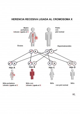 Los hombres, sin embargo, son XY. Si reciben un gen de la ictiosis ligada al X en su único cromosoma X, no tienen otros genes «normales» para anularlo porque no hay otro cromosoma X para ese. Él sólo tiene un gen recesivo, pero no hay otro gen para dominarlo así que muestra la enfermedad. El resultado para él es la ictiosis ligada al X.
